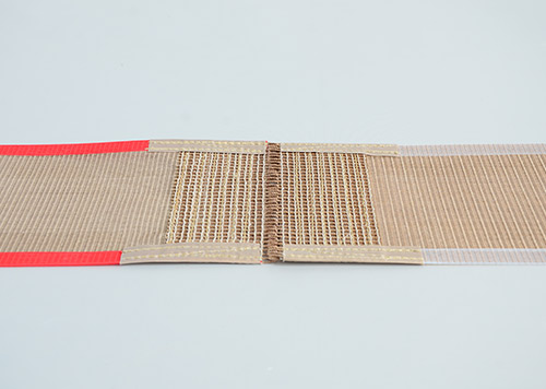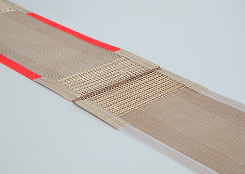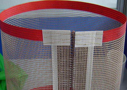 2.墻式接頭法:在網(wǎng)帶的兩頭分別用凱夫拉高溫布做圓柱狀的布條子,客戶也是直接用我們配好的鋼絲直接穿進(jìn)凱夫拉高溫布的小孔里面就行了。這種接頭方式的好處就是接頭處很耐磨,但是抗拉強度并不是很高。